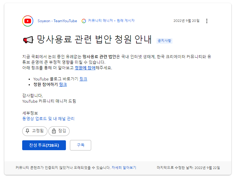 구글 유튜브 공식 자료 망사용료 이용료 관련 법안 청원 안내 및 청원 링크 Revealed Korea